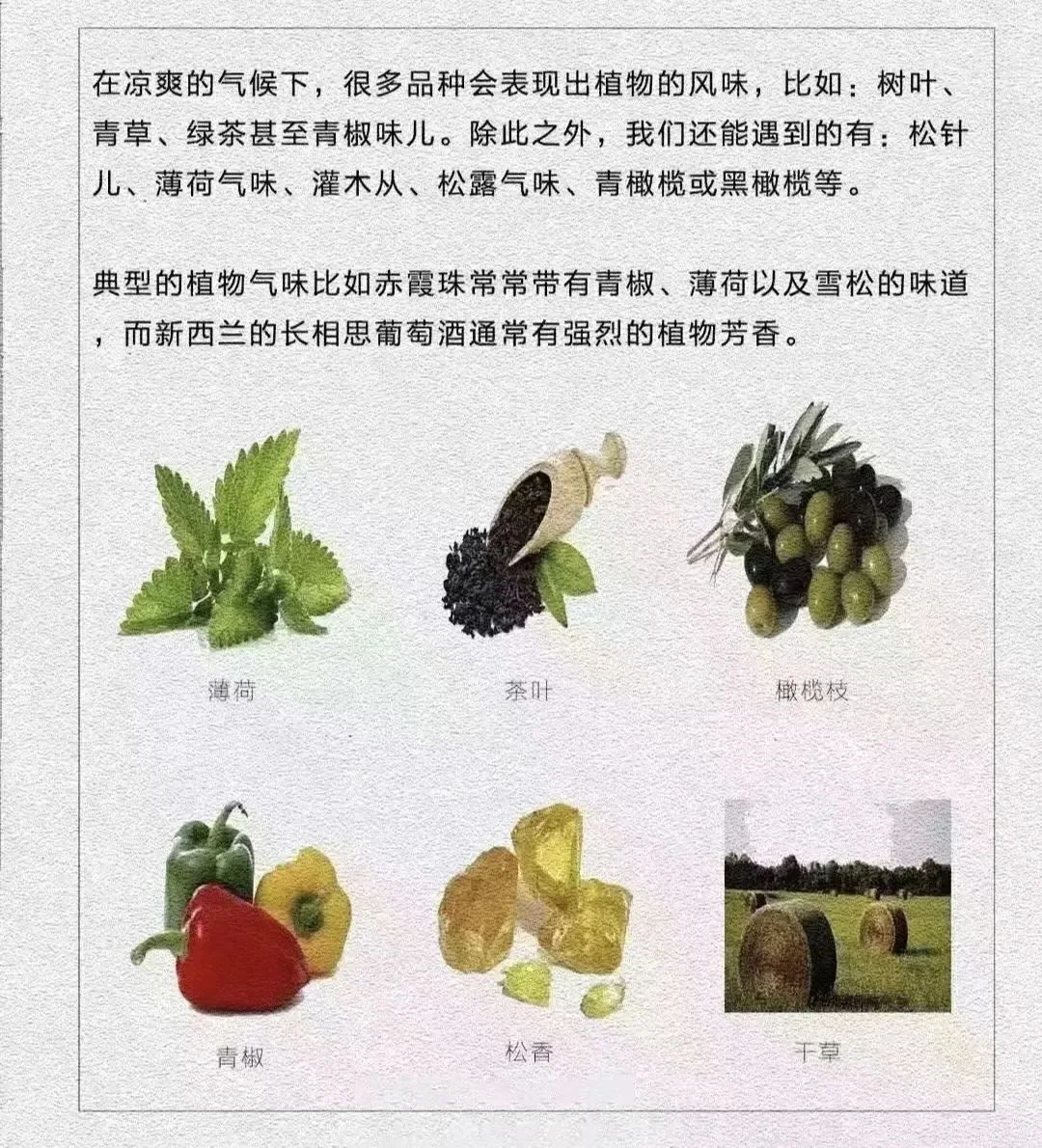 出现植物气味有3个可能:1、葡萄的成熟度欠佳,2、葡萄产区是凉爽气候,3、葡萄采收时混入葡萄园的植物。典型的植物气味有青草、鲜牧草、茴香、蕨类植物,甚至是大蒜、葱等,令人愉悦的植物香气有青椒、雪松、干牧草等。