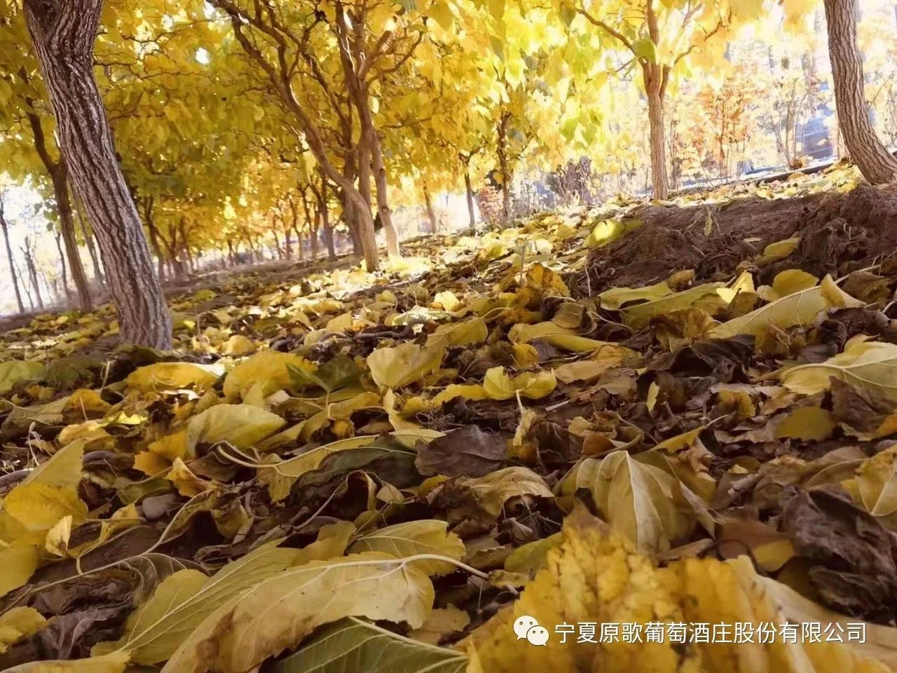 原歌十月。金秋时节,收获之时。葡萄已完全成熟,十月上旬左右,酒庄选择比较好时期进行葡萄采收,经过严格的初选、除梗、粒选精选,一颗颗红宝石被压榨成紫红色的浆液,进入发酵罐中进行发酵,酒农一年的辛劳忙碌演化成欣喜兴奋。忙碌过后,酒农惊奇的发现,庄园里已开始叶落秋黄,层层落叶布满小道,走过时发出咯咯吱吱声,别有一番情趣。