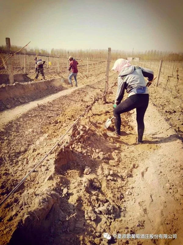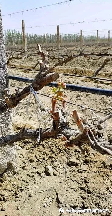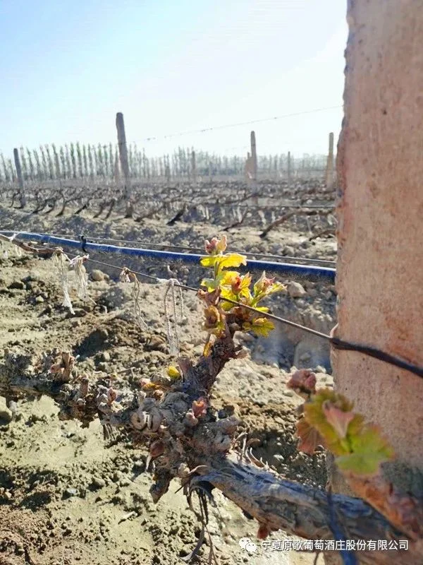 四月上旬,原歌酒庄进入春耕农忙时节,农机刮土,人工清沟,葡萄老藤开始展腾。四月下旬,所有葡萄树都已上架绑枝,葡萄芽萌发出勃勃生机。