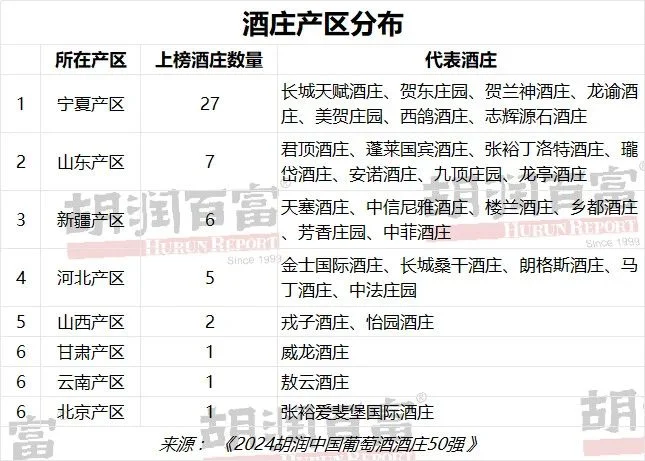“其次是山东产区,有7家酒庄上榜。此外,新疆产区有6家,河北产区有5家,山西产区有2家,甘肃、云南以及北京产区各有1家。”