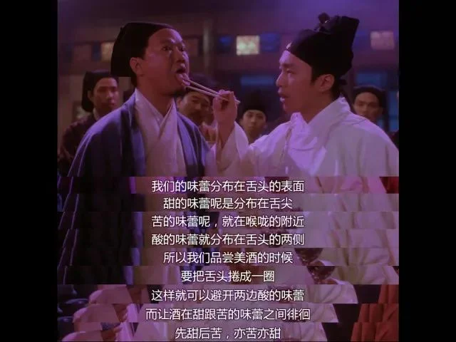 星爷有云:人的味蕾分布在舌头的表面,甜的味蕾分布在舌尖,苦的味蕾呢,就在喉咙附近,酸的味蕾就分布在舌头两侧,所以我们品尝美酒的时候,要把舌头卷成一圈,这样就可以避开两边酸的味蕾,让酒在甜跟苦的味蕾之间徘徊。先甜后苦,亦苦亦甜,就像…初恋的味道。