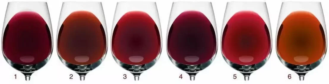 红葡萄酒的颜色有:黑红、紫红、桃红、宝石红,再加以程度副词如深、浅、淡、浓重等。新鲜的白葡萄酒通常颜色较深,带有紫色调,在存储过程中逐渐变浅,这是由于红葡萄酒中的呈色物质花色苷发生聚合反应及其他多酚类物质氧化造成的,使颜色偏向于黄色调。